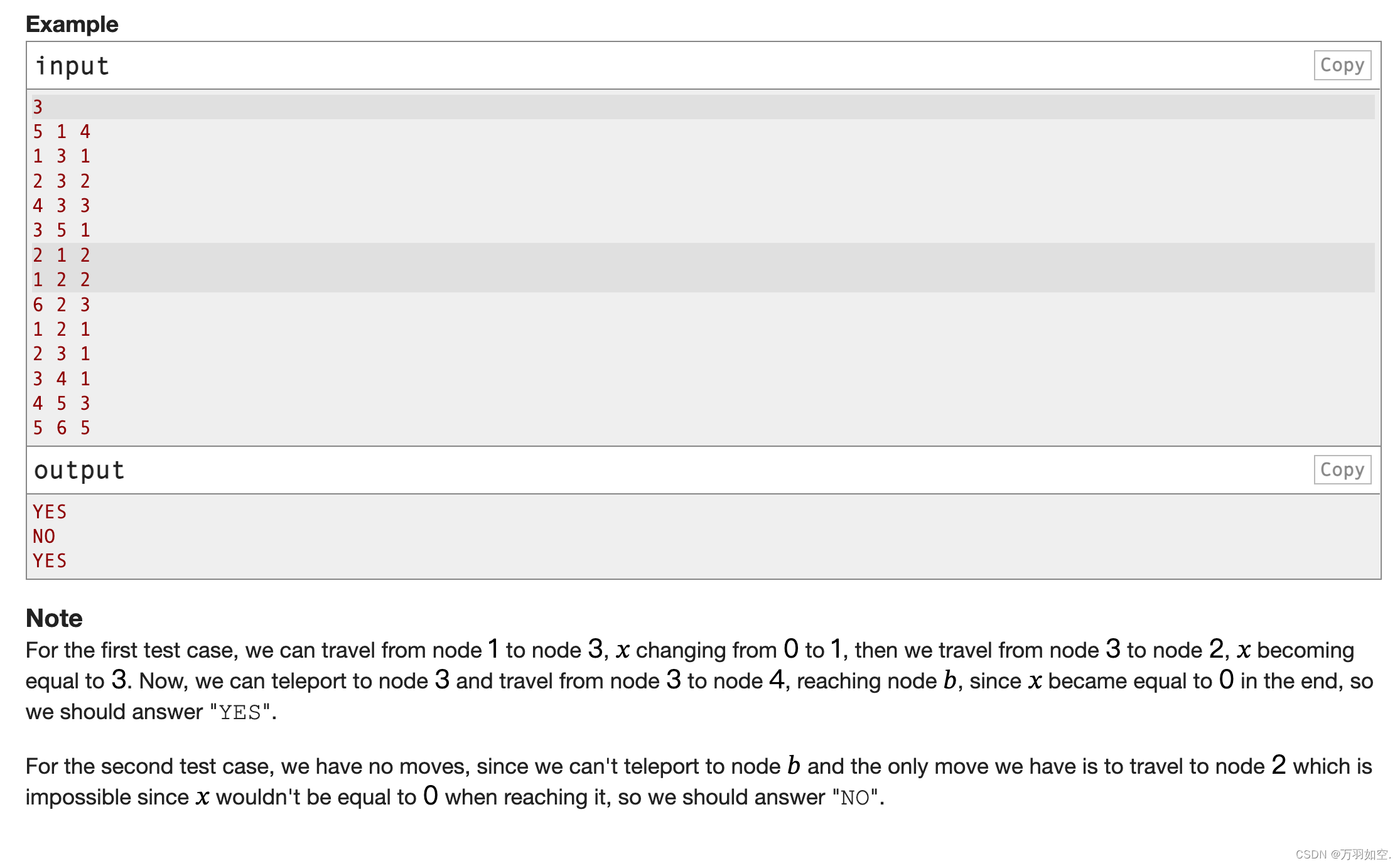 For the second test case, we have no movement because we cannot teleport to node ๐, our only movement is to move to node 2, which is impossible because ๐ is not equal to 0 when it reaches node 2, so we should answer " no".