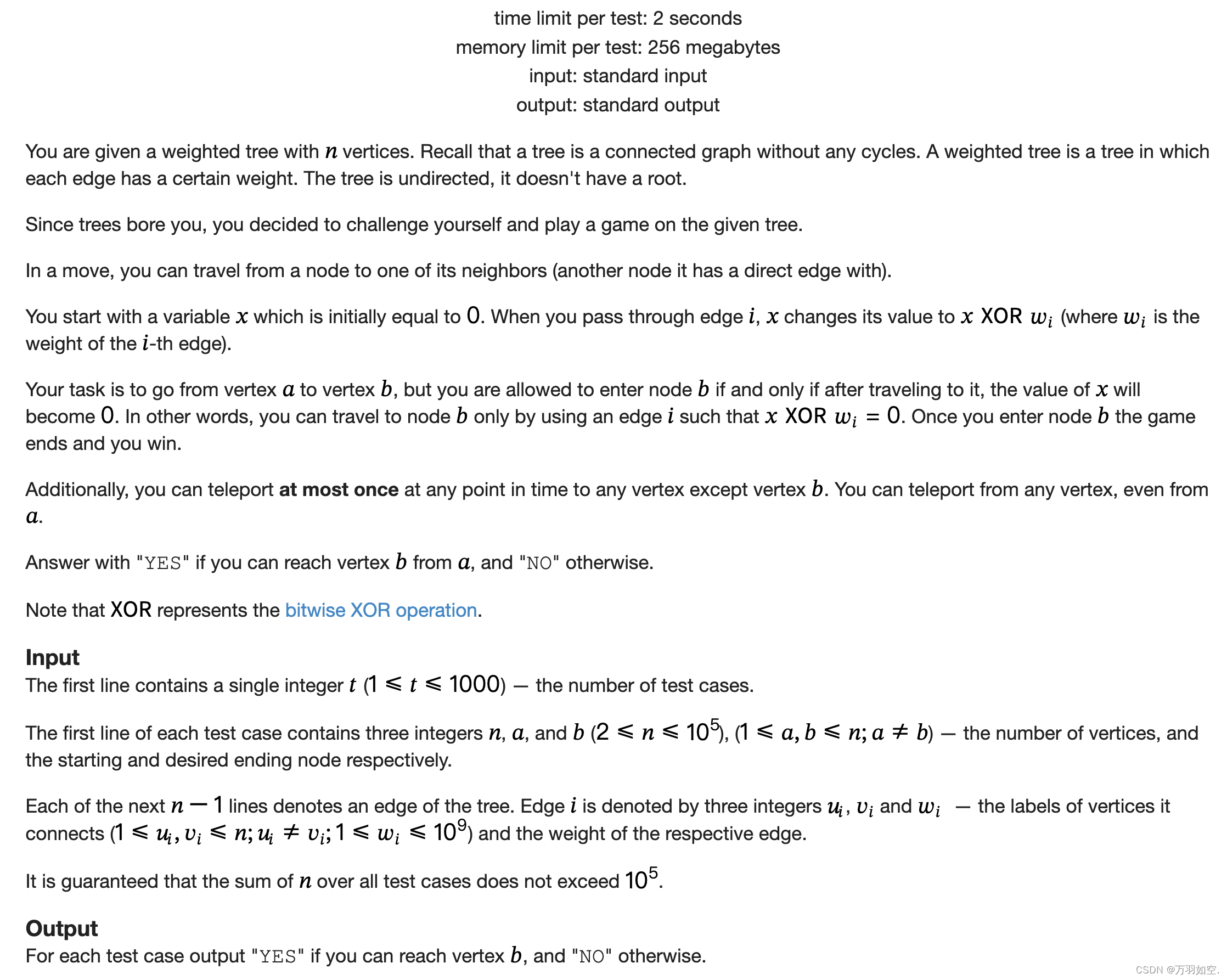 In an undirected graph , the path from a to b is always XORed, until it finally reaches 0, and can be sent to any location in the middle. Then we only need to run two dfs, and then see whether the points to each other are directly 0, or the points have the same value.